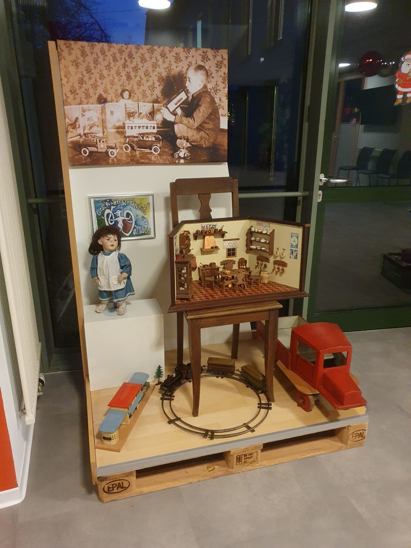 Im Seniorenzentrum „Haus in der Dorfmitte“ lädt derzeit die kleine Ausstellung „Ein Quadratmeter Geschichte“ zu einer Reise in die Kindheit ein. Initiiert wurde sie von Walter Ott und Hauke Petersen von der örtlichen Geschichtswerkstatt. Auf einer aufbereiteten Euro-Palette präsentieren sie historische Spielsachen und zeigen, wie Kinder früher spielten.