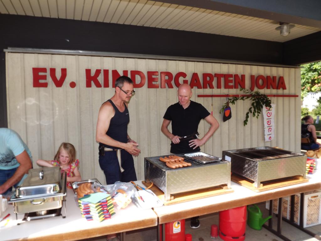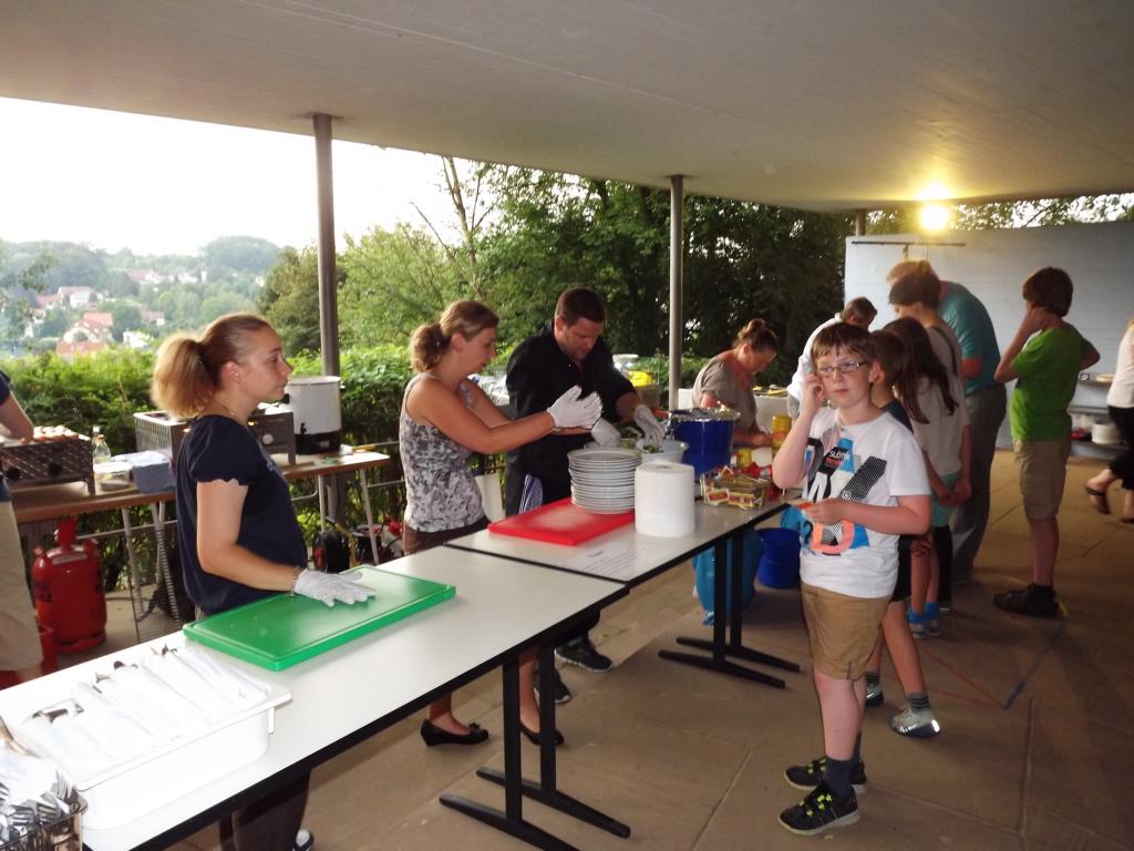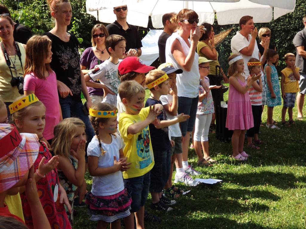 Ab 11.oo h am Samstag, 11.o7 wurde der Grill angeheitzt, damit die Würste zum Mittagessen fertig sind. Die Betreurinnen, gut erkennbar an Ihren T-Shirts, versammelten inzwischen die Kinder und alle anwesenden Begleiter zum großen Kreis. Nach der Begrüssung auch durch Ausbildungsvikar Ergenzinger sangen die Kinder ein gut einstudiertes Indianerlied.