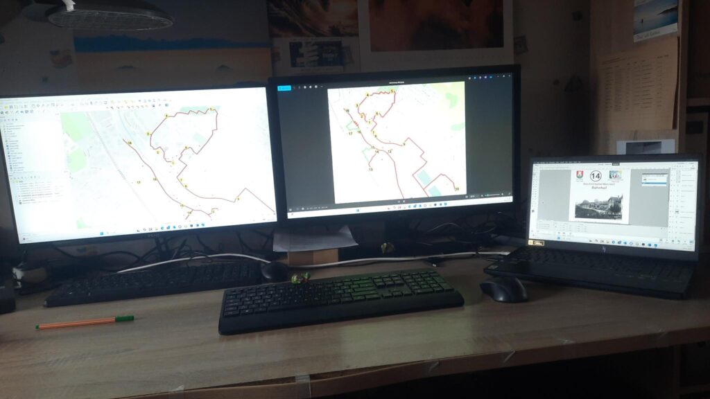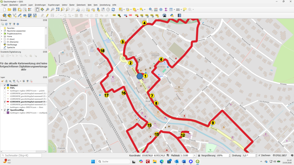 Bei der Fertigung des A0-Plakates habe ich die OpenStreetMap-Daten als Grundlage gewählt und die Landkarte mit dem Karten- und Geoinformationsprogramm QGIS aufgebaut. Dort habe ich die Route und die Stationen des Geschichtspfades deutlich hervorgehoben, Beschriftungen, Legende und Maßstab ergänzt und alles im A0-Querformat gestaltet.
