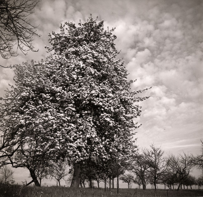 Dieses Foto eines blühenden Birnbaumes auf unserer Gemarkung wurde beim Fotowettbewerb der Gemeinde Wannweil, ausgestellt im neu eingeweihten Schulhaus (Einweihung 27.10.1956), eingereicht.