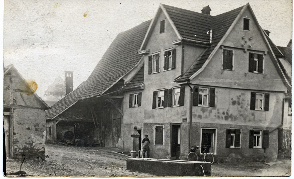 Das Haus des Metzgermeisters Adam Ebinger in der Brunnenstraße um 1920. Der aus Kusterdingen stammende Metzgermeister  Adam Ebinger (1879-1963) gründete das Geschäft in Wannweil, sein Sohn Adolf (1909-1986) führte bis zu seinem Ruhestand die Metzgerei weiter.