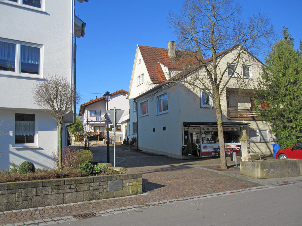 Zum Vergleich können wir gar nichts mehr verwenden. Der Brunnentrog wurde bei m Ausbau der Dorfstraße um 90 Grad gedreht, die Scheune wurde vor dem Krieg durch ein Wohnhaus ersetzt und nach dem Krieg wurde der Wohnteil des alten Hauses abgebrochen, ein damals moderner Verkaufsladen entstand.  Der Nachfolgebau des Küferhauses Rilling ist auch näher in die Brunnenstraße gerückt.