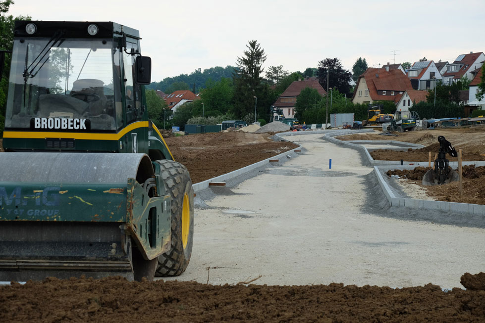 Links sieht man gerade noch das Bauernhaus des Christian Walz (1869-1947) die Grießstraße Nr.  27. Es war bis nach dem Krieg das letzte Haus am Ortsrand, danach kamen nur noch Wiesen.  Hier eine Aufnahme von 1942.  Am rechten Bildrand der Neubau eines Doppelhauses, die Grießstraße 29 der Familie Hafner. Dazwischen verläuft die Schillerstraße und führt zum Sportplatz. Nach 1950 entstanden die Häuser in der Blumenstraße und der oberen Jahnstraße als Siedlung für Flüchtlinge. Hier sieht man die Entstehung des Doppelhauses Blumenstraße 2 und 4. Über das Richtfest berichtete die Presse im Juli 1950: