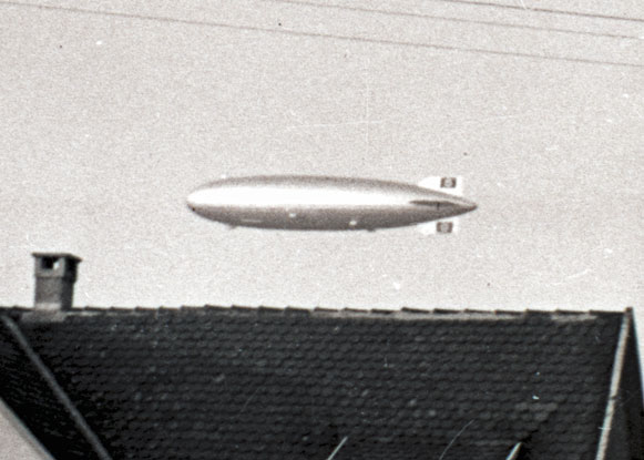 Hier sieht man den Zeppelin zwischen den Häusern von Gärtner Renz und Christian Raiser. Rechts das Haus von Küfer Rilling, welcher aus seiner Werkstatt eilte und am Zaun stehend dem Ereignis zusah. Der Mann in Bildmitte zeigt es dem Kind auf seinem Arm. Das Gebrumm der vier 16-Zylinder Dieselmotoren war bei dieser niedrigen Flughöhe nicht zu überhören. Die Hindenburg war etwa dreimal so lang wie ein Airbus 380.