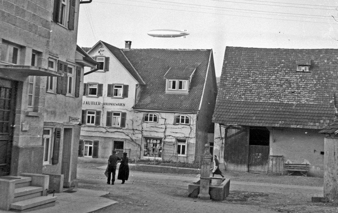 In der Bildmitte der aufende Brunnen in der Dorfstraße, links die Metzgrei Ebinger, gegenüber die Bäckerei Kuttler und daneben die Scheune von Landwirt Christian Raiser. Über dem Haus Kuttler zeigt sich der Zeppelin. Die Frau hinter dem Brunnen macht lange Schritte, sie rennt, weil sie den Zeppelin noch sehen möchte.