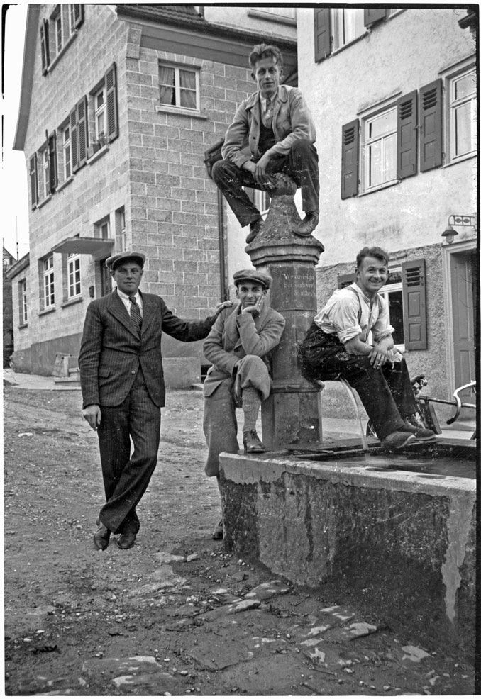 Metzgermeister Adolf Ebinger sitzt auf dem Brunnenrohr und seine Freunde nehmen den Brunnen anderweitig in Beschlag. Am rechten Bildrand sieht man noch die Ladentür zur Metzgerei. Anstelle der Scheune wurde ein paar Jahre vorher ein neues Wohnhaus mit Geschäftsräumen im unteren Geschoß errichtet. Das alte Wohnhaus muss noch bis nach dem Krieg warten, um einem modernen Metzgerladen mit darüberliegender Wohnung zu weichen. Die Brunnenstraße, in die wir hier blicken, verbindet die Dorfstraße mit der Eisenbahnstraße.